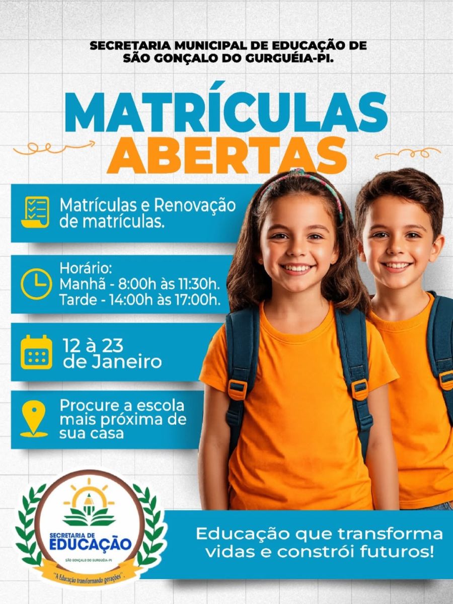 O período de matrículas e renovação de matriculas para estudantes da Rede Municipal de ensino em São Gonçalo do Gurgueia (PI) teve início na segunda-feira, 12 de janeiro, e seguirá até o dia 23 de janeiro de 2025.